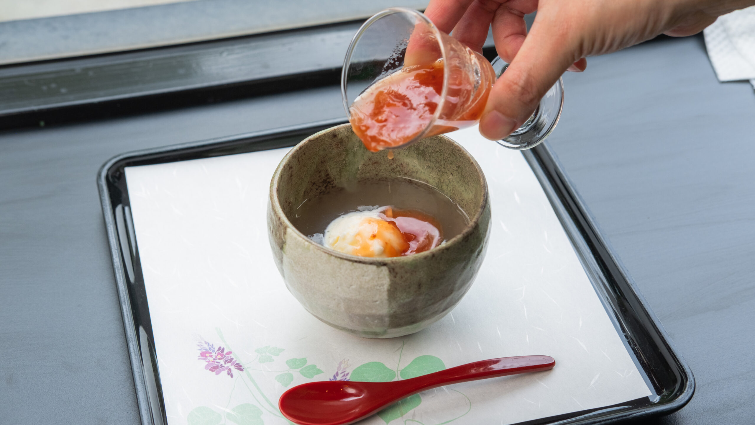 プレーン葛湯にバニラアイスと、日本酒仕込みの果実リキュール「大人の果肉の沼(いちご/マンゴー/もも)」を添えた限定メニュー。