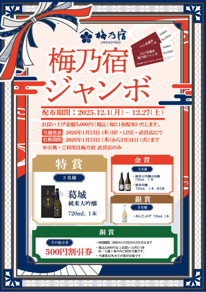 当選発表:2026年1月15日(木) 梅乃宿酒造直営店店頭・LINE・HPにて(午前10時発表)