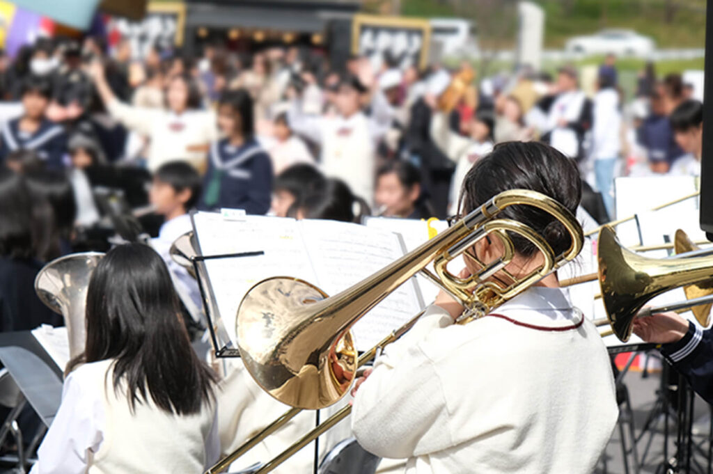 地元中学校の合同チームによる華やかな吹奏楽の音色が会場を彩ります。