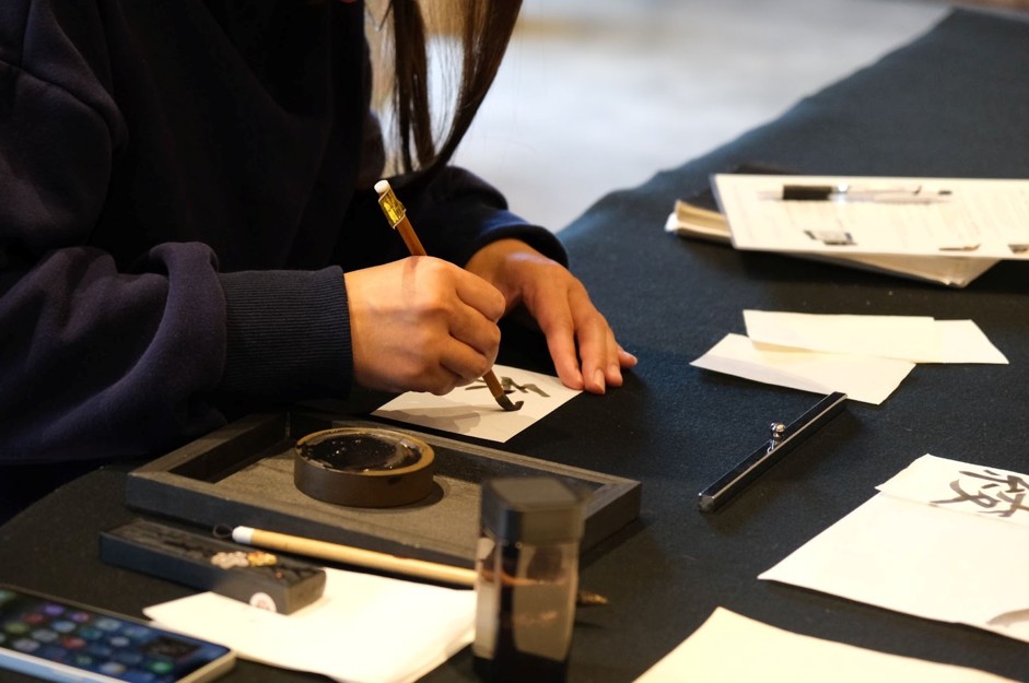 後半はいよいよ、ならまち書道サロン「ただいま」様による書道体験です。講師にお迎えした坂本先生の温かく丁寧な指導のもと、会場は墨の心地よい香りに包まれました。